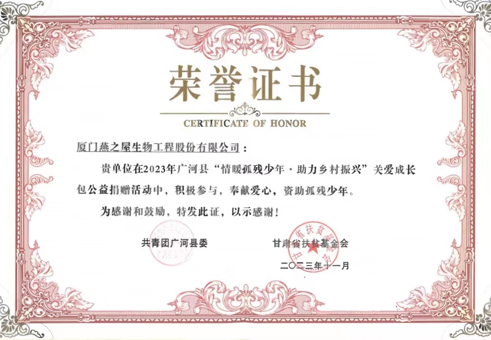 圖:燕之屋榮獲廣河縣“情暖孤殘少年·助力鄉(xiāng)村振興”關(guān)愛成長(zhǎng)包公益捐贈(zèng)活動(dòng)榮譽(yù)證書