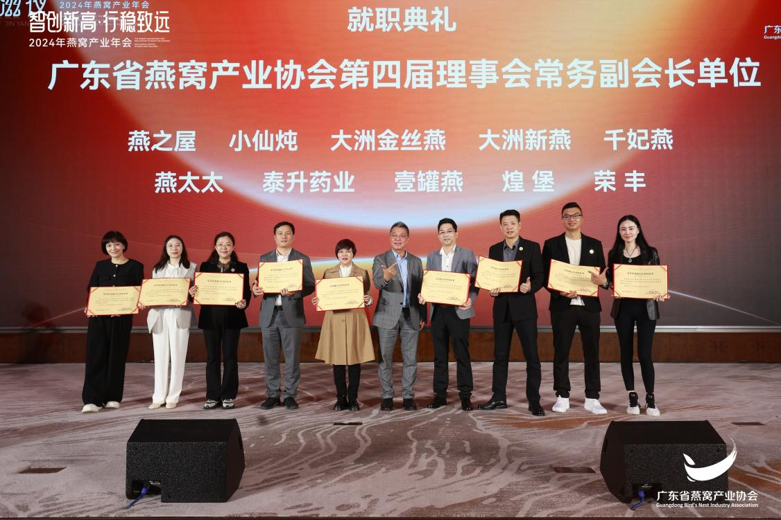 大會結(jié)束后,主辦方邀請所有嘉賓共享“金燕滋夜”晚宴,在美酒佳肴中繼續(xù)碰撞智慧思想。宴席期間同步舉行了就職典禮與授牌儀式,燕之屋被授予廣東省燕窩產(chǎn)業(yè)協(xié)會第四屆理事會常務(wù)副會長單位、2024年燕窩產(chǎn)業(yè)年會榮耀支持單位以及2024年燕窩產(chǎn)業(yè)年會特約支持單位榮譽,燕之屋公關(guān)總監(jiān)楊航上臺領(lǐng)取證書。