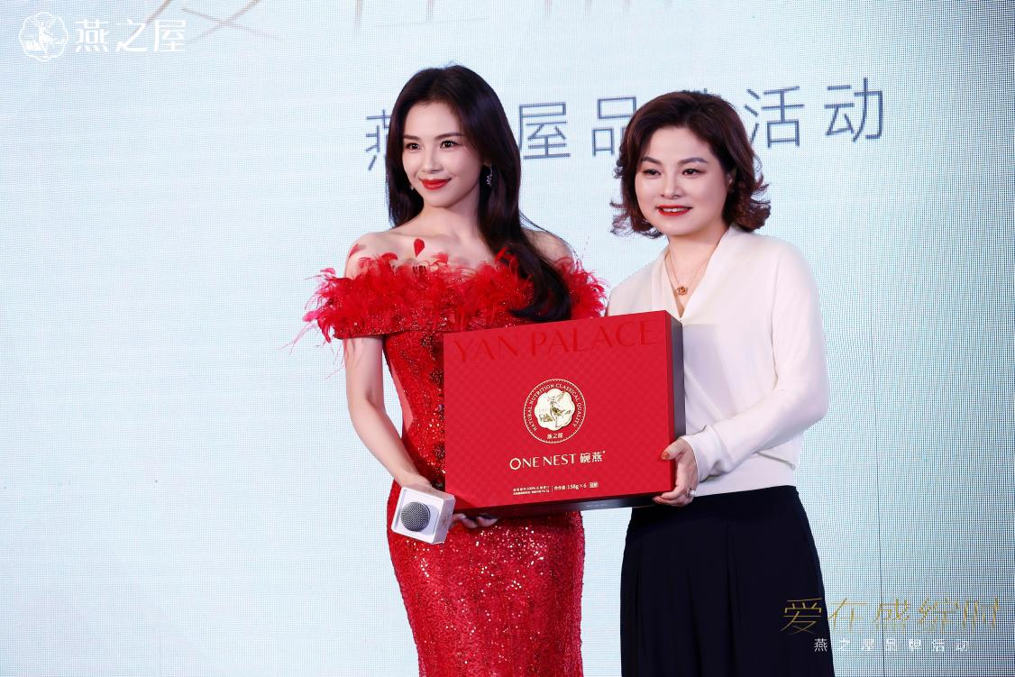 圖:燕之屋副總經(jīng)理、連鎖事業(yè)部總經(jīng)理翁惠貞為著名演員劉濤送上碗燕·尊享款禮盒