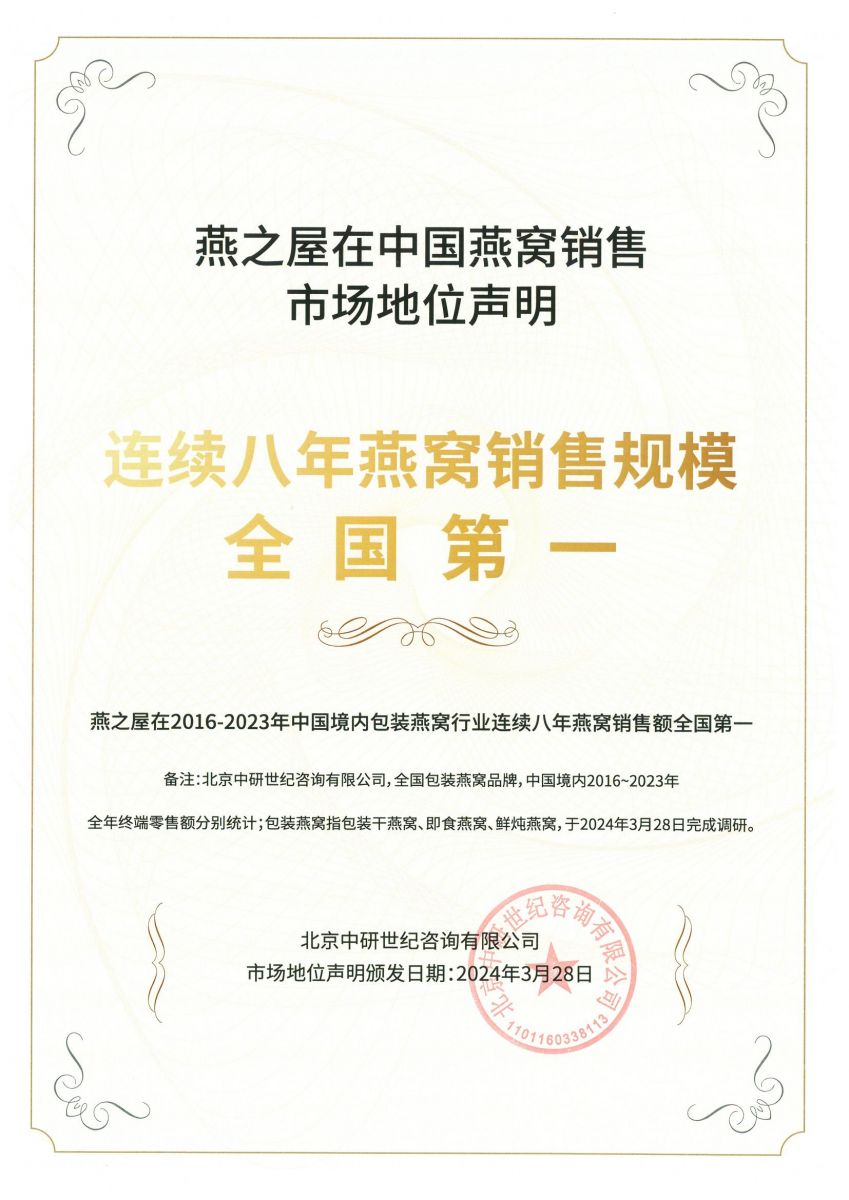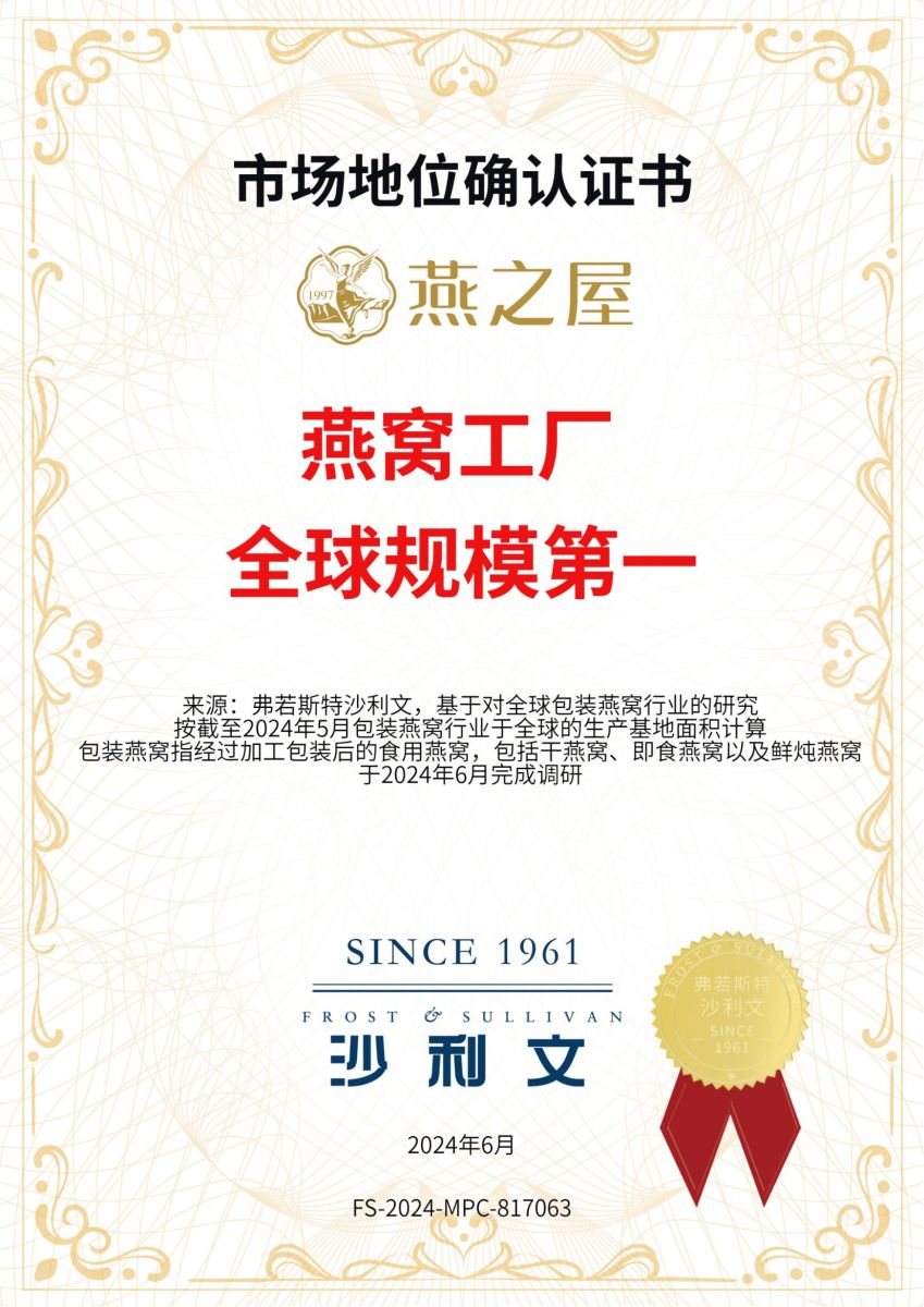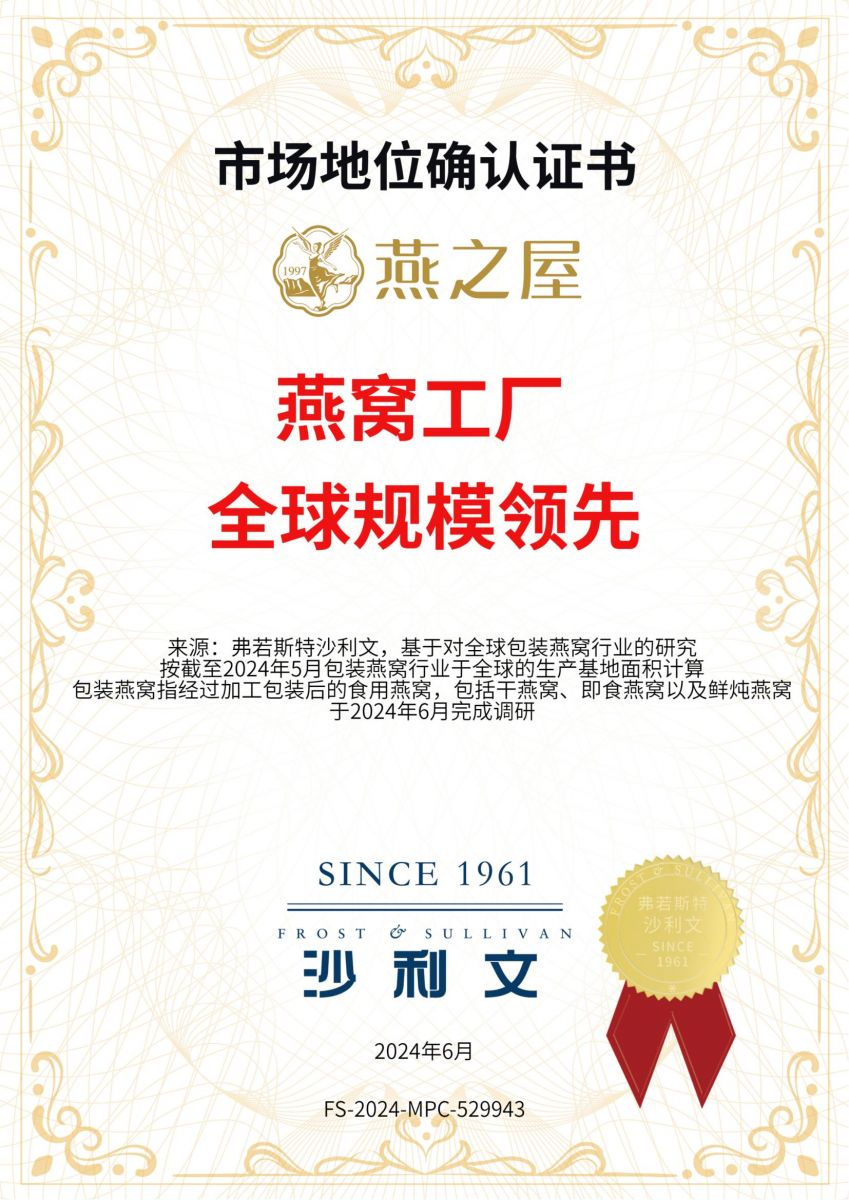 再顯實(shí)力!燕之屋獲沙利文市場地位確認(rèn)證書,燕窩工廠全球規(guī)模第一