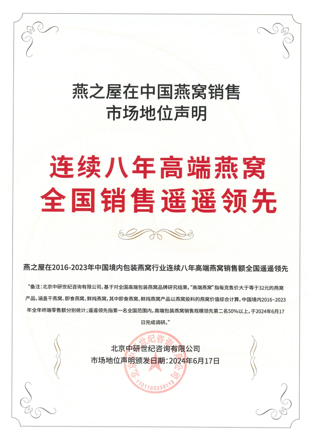近日,根據(jù)北京中研世紀(jì)咨詢有限公司統(tǒng)計顯示,燕之屋連續(xù)八年高端燕窩全國銷售第一*(*燕之屋在2016-2023年中國境內(nèi)包裝燕窩行業(yè)連續(xù)八年高端燕窩銷售額全國第一)、燕之屋連續(xù)八年高端燕窩全國銷售遙遙領(lǐng)先*(*燕之屋在2016-2023年中國境內(nèi)包裝燕窩行業(yè)連續(xù)八年高端燕窩銷售額全國遙遙領(lǐng)先),不僅體現(xiàn)了燕之屋硬核的產(chǎn)品力和強大的品牌影響力,也證明了其在燕窩行業(yè)的頭部地位。