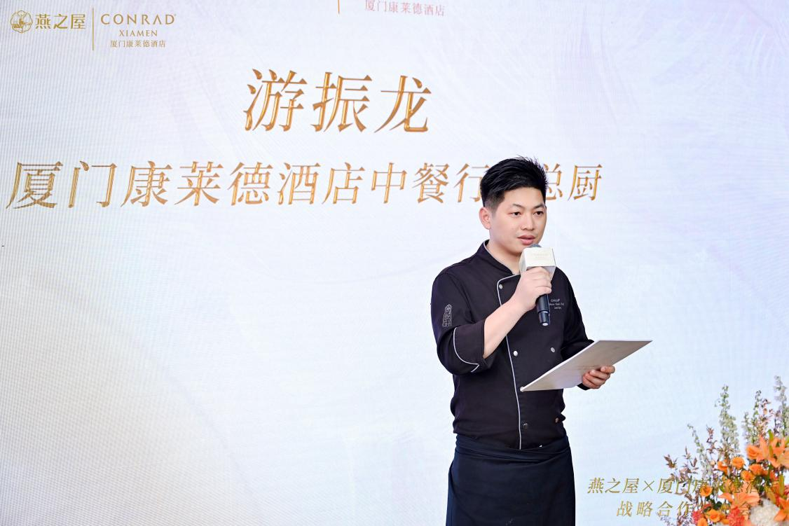 廈門康萊德酒店總經(jīng)理莫永泉也對此次合作滿懷期待,他在致辭中說道:“燕之屋作為一家26年的燕窩專營企業(yè),是中國上市的高品質(zhì)燕窩品牌,擁有廣泛的知名度與美譽(yù)度。康萊德品牌成立于1982年,是百年酒店管理公司希爾頓集團(tuán)旗下的奢華酒店品牌,倡導(dǎo)自信、創(chuàng)新與融合,我們的合作一拍即合。我們都知道好的菜品跟主廚的理解、烹飪方法和對食材品質(zhì)的挑剔,缺一不可。燕之屋的燕窩品質(zhì)是首屈一指的,非常榮幸可以有機(jī)會和燕之屋一起研發(fā)菜單。”