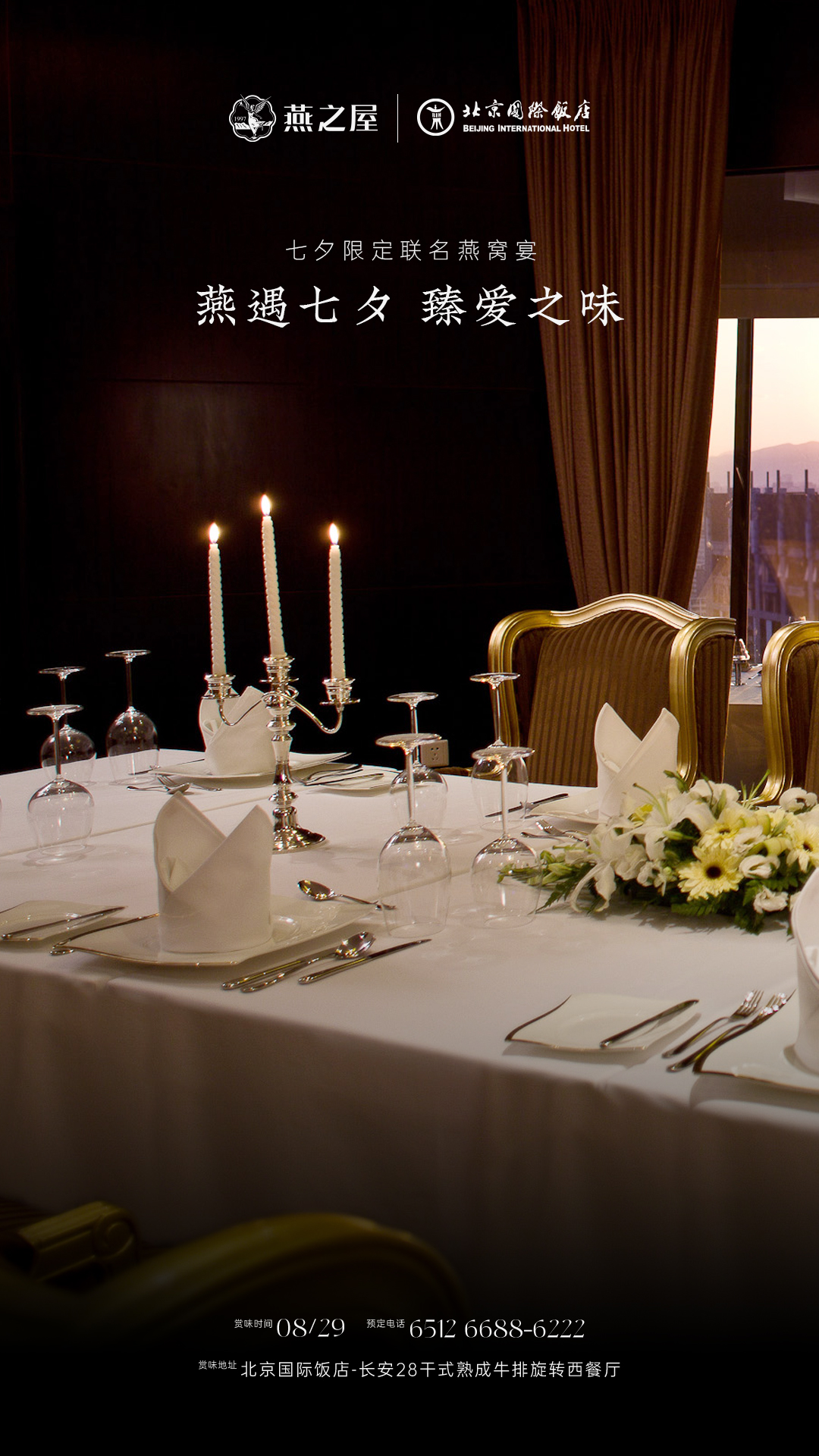 北京國(guó)際飯店長(zhǎng)安28餐廳作為北京市中心高空360度環(huán)瞰京城盛景的旋轉(zhuǎn)餐廳,以其獨(dú)特的奢華與雅致并存的裝修風(fēng)格,成為京城高端餐飲場(chǎng)所。604㎡餐廳空間、100個(gè)精致餐位,3間多功能廳房,配合專業(yè)的服務(wù)團(tuán)隊(duì),為每位賓客提供尊貴的用餐體驗(yàn)。燕之屋27年專注高品質(zhì)燕窩,始終堅(jiān)持“源于天然,美與健康”的理念,以創(chuàng)新科研賦能上乘品質(zhì),連續(xù)九年高端燕窩全國(guó)銷售第一①。此次合作是云端視野與輕奢品味的雙重尊享,正如每一對(duì)相約七夕的甜蜜愛侶。