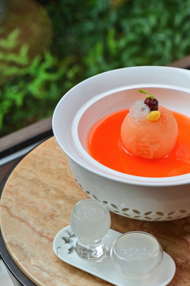 金巢玉露應燕歸,取形制優(yōu)美的菊瓜為器,蒸至甘軟后注入香濃椰奶,綴入繽紛鮮果與晶瑩燕窩。瓜體的清甜與椰韻的馥郁相融,燕絲穿梭其間,營造出豐富而和諧的味覺體驗,寓意金秋歸巢,溫潤養(yǎng)人。